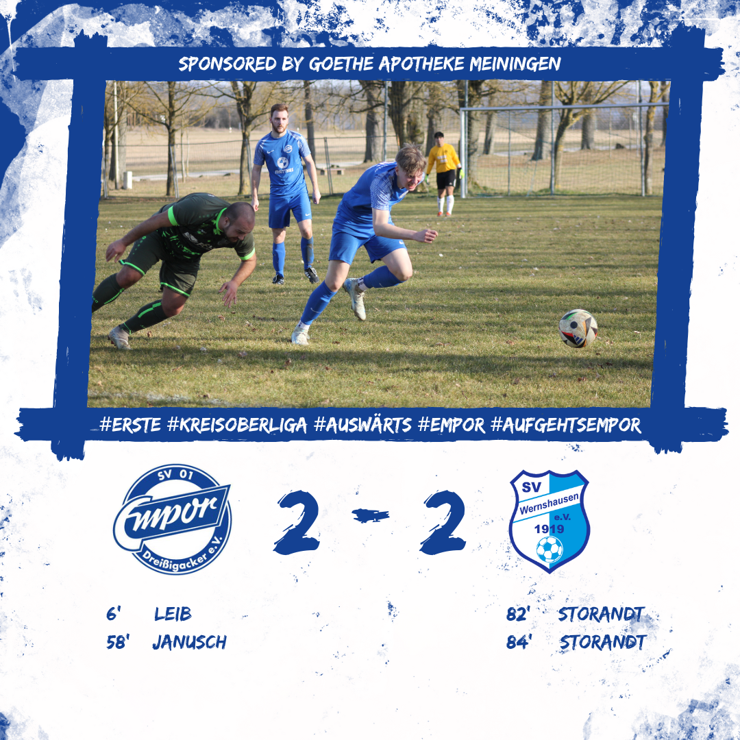 Mit einem 2:2 Unentschieden endete am Sonntag die gegen Ende doch noch turbulente Partie zwischen Wernshausen und Dreißigacker. Mit dem Punktgewinn ist die Empor zwar mittlerweile das dritte Spiel in Folge ungeschlagen, muss sich über die zwei späten Gegentore aber dennoch ärgern.