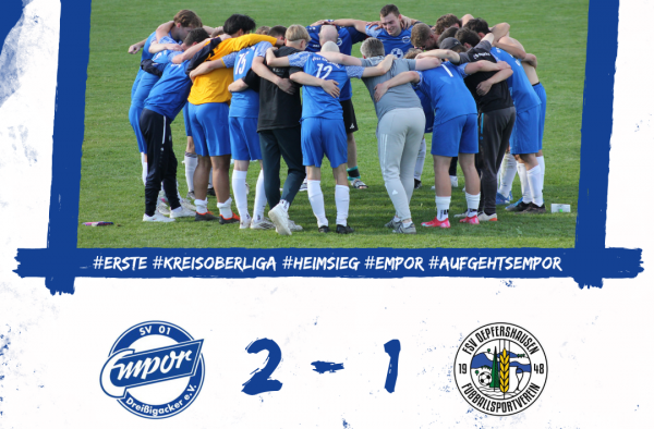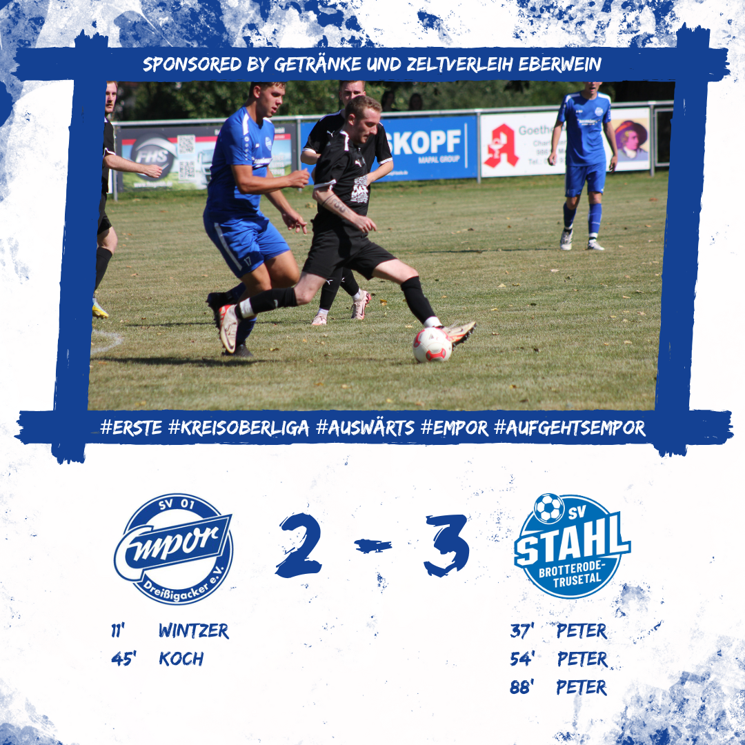 Gleich zu Beginn der Partie schienen die Hausherren ihrer Favoritenrolle gerecht zu werden und drückten Dreißigacker tief in die eigene Hälfte. In den ersten 10. Spielminuten konnte sich die Empor dabei glücklich schätzen, nicht schon in Rückstand geraten zu sein und durfte sich insbesondere bei Keeper Heß bedanken, der mehrfach in letzter Not zur Stelle war und sogar einen Elfmeter von Schröder souverän parieren konnte (3.). Überraschenderweise fiel das erste Tor des Spiels dann aber auf der Gegenseite: mit dem ersten richtigen Torschuss der Gäste ging die Empor durch Wintzer früh in Führung und stellte den Spielverlauf auf den Kopf (12.). Sichtlich angeschlagen gelang es den Hausherren in der Folge kaum, zurück zur Leistung der ersten 10. Spielminuten zu finden. Dreißigacker verteidigte mittlerweile deutlich stabiler und setzte selbst einzelne Nadelstiche durch schnelles Umschaltspiel. Erst Richtung Pausenpfiff nahm die Partie wieder mehr Fahrt auf. Nach einem schnell ausgeführten Einwurf brach Brotterode über die linke Außenbahn durch und bei der Hereingabe ins Zentrum ließ sich Peter nicht zweimal bitten (38.). Den Ausgleich zur Pause fast sicher im Gepäck, stellte die Empor den Spielverlauf aber nur wenige Minuten später erneut auf den Kopf. Nach einem Ballgewinn auf der rechten Seite, standen die Hausherren zu unsortiert und liefen direkt in einen Konter der Gäste hinein. Mit guter Übersicht fand Leib mit seiner Flanke den völlig freistehenden Koch im Sturm der Gäste, der im 1 gegen 1 mit dem Schlussmann der Hausherren ohne Bedrängnis zur erneuten Führung einschob.